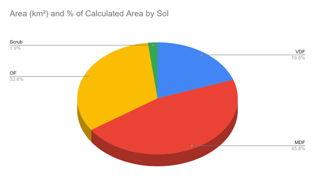 Slope (degrees)Calculated Area by SoI (km²)VDF (km²)MDF (km²)OF (km²)Total (km²)Scrub (km²)