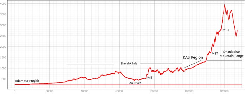 (Image 3: The Long Profile slope between Adampur (240 ,31.43305655966964, 75.71803090201695) and the Dhauladhar (3941 m, 32.23465,76.68527) was calculated using a 30 m resolution Shuttle Radar Topography Mission (SRTM) Digital Elevation Model (DEM) in QGIS 3.40.5 (Bratislava), projected to the Universal Transverse Mercator coordinate system (CRS: EPSG 32643 – WGS 84/UTM Zone 43N).