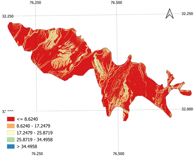 (Image 2: The map shows local surface slope variation in the KAS region derived from SRTM DEM. Gentle slopes (≤8.6°) dominate the alluvial plains suitable for Kuhl irrigation and farming, while moderate to steep slopes (>17°) occur along the Dhauladhar foothills, used mainly for forests and tea plantations. The slope pattern reflects strong geomorphic control over land use and irrigation layout)