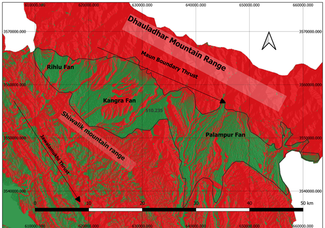 The Kangra Reentrant (31°45′N–32°15′N and 75°30′E–77°00′E) forms part of the Sub-Himalayan zone, where the Main Boundary Thrust (MBT) exhibits a broad curvature. It represents the largest inward bend of the Himalayan mountain front, stretching nearly 80 km across the Sub-Himalayan belt. The reentrant is shaped by a gently northward-tilting crust with slopes of about 2.5–3 degrees (Powers et al., 1998), forming a broad depositional basin at the foot of the Dhauladhar Range (Image 2). Descending rivers from Dhauladhar have deposited thick layers of sediments, creating extensive alluvial fans and fertile plains. Owing to its scale and morphology, Powers et al. (1998) referred to this feature as the “Kangra Paradox.”