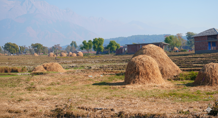 (Image 9: The image shows terraced paddy fields at the base of the Dhauladhar Range, dotted with dome-shaped straw heaps locally known as Kuhada. These structures are built after the rice harvest for fodder preservation and soil protection during winter. The spatial arrangement of fields, settlements, and mountains in the background reflects the harmony between geomorphology and agriculture typical of the Kangra landscape. Such field-level practices demonstrate how traditional farming integrates resource efficiency, community labor, and climatic adaptation—core values of the FAO–GIAHS framework.)