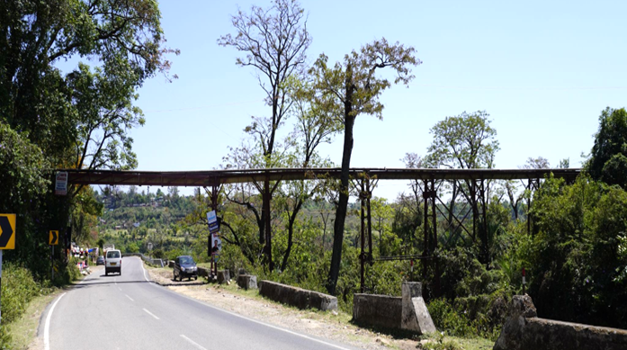 (Image 8: Steel aqueduct carrying a Kuhl channel across a road near Palampur, Kangra. The structure represents the engineering adaptation of traditional irrigation systems (Kumar, 2025)