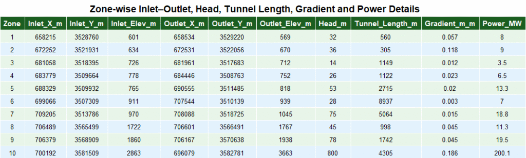 Table-1, Showing the latitude, longitude, Elevation , Gradient and Power of Each Inlet-Outlet Point.